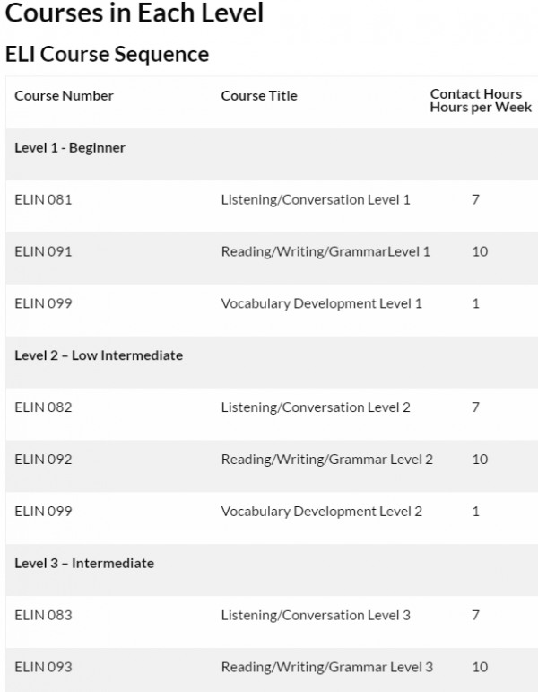 ELI 프로그램 일정은 쿼터 시스템을 기반으로합니다. 가을, 겨울, 봄, 여름에 시작되는 해에는 4번의 학기로 진행됩니다.습니.기간은 여름을 제외하고 지난 11 주, 즉 8 주입니다. 그러나 여름 방학은 15 분 더 길어 학생들은 정규 수업시간과 동일한 수업 시간을 받게됩니다. 늦은 여름 4시30분 주간 프로그램도 있습니다.