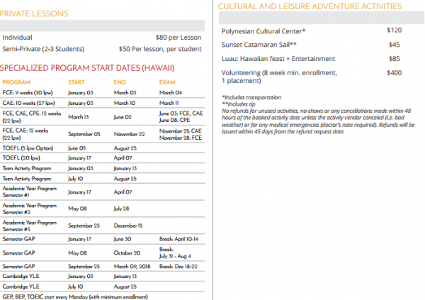 선택 활동 Parasailing Add Shark Cage Dive 스카이 다이빙 Add Zip Line Add Catamaran Snorkeling Add On Dolphin Swim 카약에 오션 카약 카이트 서핑에 3 시간 개인 레슨 Standup Paddleboard에 서핑 레슨 2시간 초급그룹 레슨 폴리네시아 문화센터 Add On Sunset Catamaran Sail Add Luau : Hawaian Feast + Entertainment .. 자원 봉사에 추가 (최소 8주 등록) 대학진학 프로그램 - 주당 25 레슨 : 20 lpw + Options