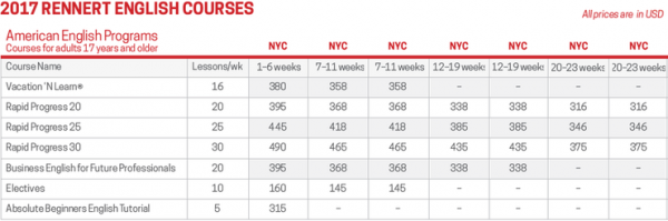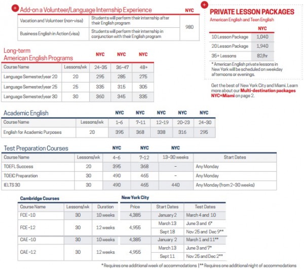 | 프로그램 | American English Program Vacation 'n Learn 주당 16레슨 이 프로그램을 통해 학교 위치를 깊이 경험하면서 영어 실력을 향상시킬 수 있습니다. 일주일에 네 번 오전, 오후 또는 오후에 네 번의 수업을 받게됩니다. Rennert의 다양한 활동 일정을 활용하여 매일 3일간의 주말뿐만 아니라 나머지 시간을 즐길 수 있습니다. 강사로부터 더 많은 관심을 받으며 충분한 말하기 말하기, 그룹 활동, 쌍 작업 및 발표에 중점을 둡니다. 교사가 진행하는 견학 및 문화 활동으로 수업이 향상됩니다. 수업: 주당 16레슨/주4일/ 1일 4레슨(금요일선택가능) 한반인원: 최대 12명 레벨: 초급-고급 수업시간: 오전 9시-오후 12시 40분 또는 오후2시-오후 5시 40분 개강일: 매주 월요일 Rapid Progress 주당 20레슨 이 세미 인텐시브 프로그램을 통해 뉴욕에서 과외활동을하면서 충분한 시간을 들여 영어 공부를 빠르게 진행할 수 있습니다. 수업은 하루 4시간, 오전 또는 오후에 진행됩니다. 뉴욕의 Rennert 학생들과 함께 제공하는 모든 것을 즐기기 위해 자유시간을 이용하십시오. 영어 실력을 향상시키고 의사 소통을 향상시키고 자합니다. 이 프로그램은 새로운 언어 실력을 사용할 수있는 기회가 많아서 영어권 국가에서 듣기, 말하기, 읽기 및 쓰기를 배우고 실습하는 데 도움이됩니다. 수업: 주당 20레슨/ 주4일/ 1일 4레슨 한반인원: 최대 12명 레벨: 초급-고급 수업시간: 오전 9시-오후 12시 40분 또는 선택과목은 오후2시-오후 4시 5분 개강일: 매주 월요일 Rapid Progress 주당 30레슨 우리의 가장 집중적 인 프로그램은 오전 수업과 오후 수업 (금요일 수업은 없습니다)이 포함 된 하루 6교시 수업을 제공합니다. 특히 대화 기술에 중점을 둡니다. Rennert는 교실 학습을 보완하기위한 광범위한 활동 일정을 제공합니다. 수업 시간에 영어를 배우고 저녁 시간과 주말에 뉴욕을 즐겨 보세요! 영어 실력을 향상시키고 의사 소통을 향상시키고 자합니다. 이 프로그램은 영어를 사용하는 나라에서 듣기, 말하기, 읽기 및 쓰기를 배우고 실습하는 데 도움이되며 새로운 언어 기술을 사용할 수있는 기회가 충분히 주어집니다. 수업 프로그램에는 대화, 발음, 작문 및 TOEFL 준비와 같은 다양한 관심사가있는 추가 수업 선택 수업이 포함되어 있습니다. 수업: 주당 30레슨/주5일 한반인원: 최대 12명 레벨: 초급-고급 수업시간: 오전 9시-오후 12시 40분, 오후2시-오후 5시 40분 개강일: 매주 월요일 Business English 변화하는 비즈니스 세계에서 의사 소통하는 데 필요한 언어 능력을 개발함으로써 성공적인 경력을 쌓을 수 있습니다. 이 과정은 대학생 및 비즈니스 경력을 추구하려는 최근 졸업생에게 이상적입니다. 이전 직장 경험은 기대하지 않습니다. Rennert의 비즈니스영어 수업은 지도력, 마케팅, 외국인 투자, 자금 및 금융, 새로운 시장 및 팀 구성과 같은 주제와 관련된 언어에 초점을 맞추고 소개하는 주 단위 모듈을 보유하고 있습니다. 비즈니스 영어 어휘를 늘리고 모의 비즈니스 시나리오, 토론, 서면 연습 및 프레젠테이션에 사용하십시오. 수업: 주당 20레슨, 주당 5레슨, 하루 4레슨 한반인원: 최대 12명 레벨: 중상급-고급 수업기간:1 - 16주 수업시간: 오전 9시-오후 12시 40분 또는 오후2시-오후 5시 40분 과정 완료시 수료증 개강일: 매주 월요일