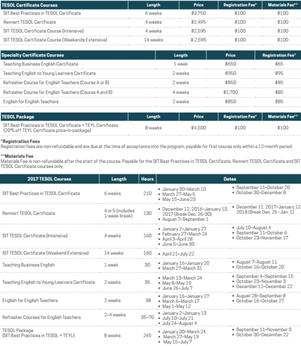 SIT TESOL 프로그램 한국학생들이 많이 참가하는 테솔프로그램, SIT Graduate Institute University 에서 발급되는 수료증 과정 기간: 6주 수업요일: 월-금 수업시간: 9시 ~ 5시=총 210시간 수업 마지막 4주째는 실제 성인 Beginner Level 학생들을 대상으로 하여 실습제공
